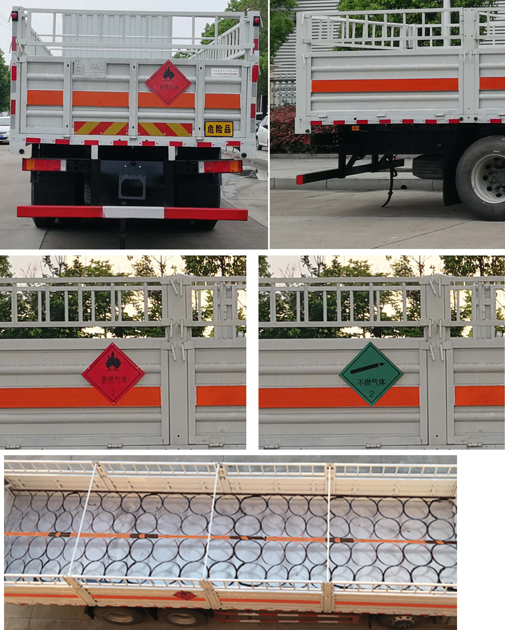 | 1、該車為危險(xiǎn)品運(yùn)輸車.該車用于運(yùn)輸具有獨(dú)立容器(瓶)包裝的易燃?xì)怏w:液化石油氣,壓縮甲烷或甲烷含量高的壓縮天然氣,乙炔,乙烷,丁烷,丁烯,丙烯,二甲醚,壓縮氫,類項(xiàng)號(hào)2.1;用于運(yùn)輸具有獨(dú)立容器(瓶)包裝的非易燃無毒氣體:二氧化碳,壓縮氧(氮,空氣,氦,氬,氖),類項(xiàng)號(hào):2.2。液壓升降尾板收起狀態(tài)水平長度為290mm,尾板質(zhì)量為550kg。2、側(cè),后防護(hù)材料均為Q235,螺栓連接;后防護(hù)截面為圓形,直徑為120mm,下邊緣離地高500mm。選裝后部無液壓升降尾板,選裝后部無尾板時(shí),后防護(hù)螺栓連接,截面尺寸120×60mm,下邊緣離地高500mm。3、隨底盤選裝平頂駕駛室;選裝駕駛室前面罩;高頂駕駛室頂部氣喇叭為選裝件;駕駛室前角擾流板為選裝件。僅選用排氣管前置、限速裝置(限速80km/h)、前輪盤式制動(dòng)及子午線輪胎的底盤;安裝帶衛(wèi)星定位功能的行駛記錄儀。ABS型號(hào)/生產(chǎn)廠家:ABS 8/東科克諾爾商用車制動(dòng)系統(tǒng)(十堰)有限公司。采用的發(fā)動(dòng)機(jī)DDi75E350-60對(duì)應(yīng)油耗值為38.1L/100km。后軸采用空氣懸架,轉(zhuǎn)向輪裝備輪胎爆胎應(yīng)急防護(hù)裝置。 | |||